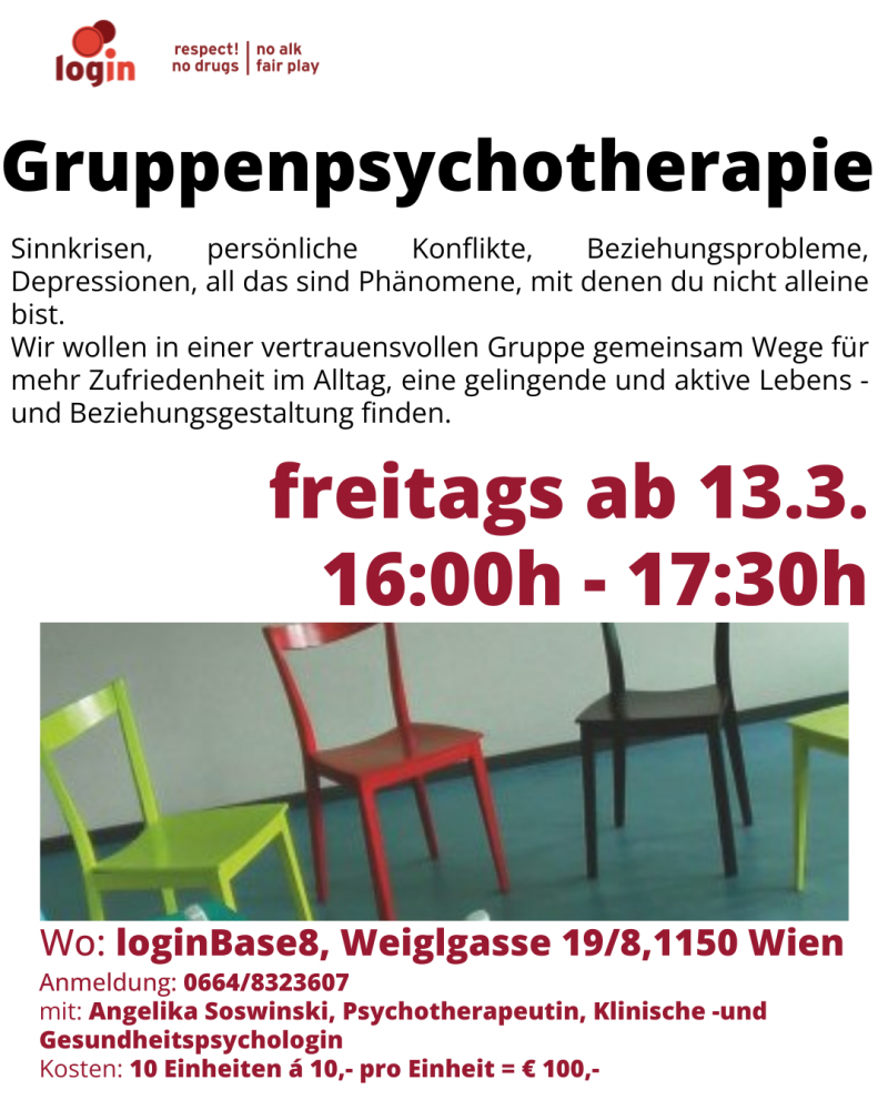 In der therapeutischen Gruppe, mit dem Schwerpunkt auf mehr Zufriedenheit im Alltag und in Beziehungen, geht es um Dialog und Austausch von Erfahrung in einem vertrauensvollen Umfeld. Gemeinsam, mit Kraft der Gruppe werden Wege gefunden mit schwierigen Situationen und Umständen im Leben besser zurecht zu kommen.