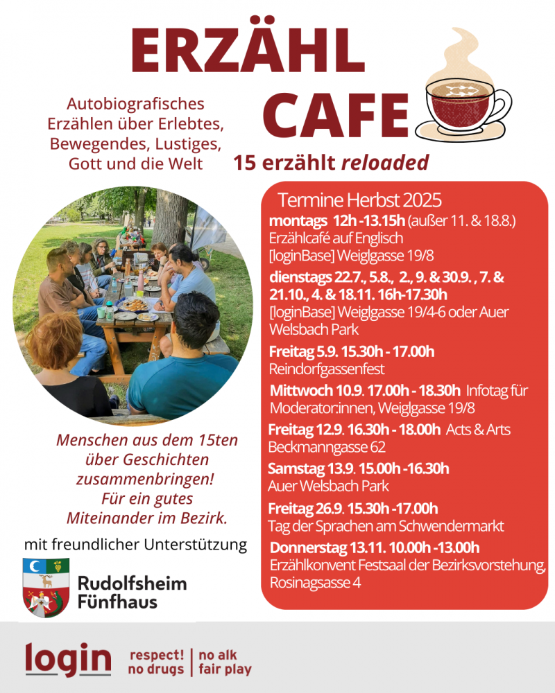 Das Projekt Erzählcafé 15 reloaded - ist die Fortsetzung des Projektes 15 erzählt (VHS Rudolfsheim) und wird von der Bezirksvorstehung Rudolfsheim Fünfhaus finanziert - Einrichtungen im Bezirk sind eingeladen sich am Projekt zu beteiligen und auch Erzählcafés anzubieten. Infos sind hier zu finden: Infoflyer