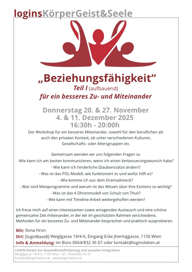 In dieser 3-stufigen Workshopserie widmen wir uns Kommunikationsstrategien, die uns unterstützen sollen, besser miteinander auszukommen, sowohl für den beruflichen als auch den privaten Kontext, ob unter verschiedenen Kulturen, Gesellschafts- oder Altersgruppen etc.